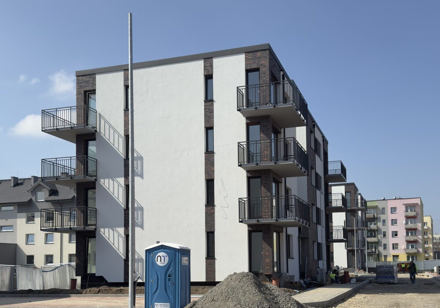 Projekt wymagał połączenia wysokich standardów bezpieczeństwa z estetyką nowoczesnego budownictwa mieszkaniowego. Wykonaliśmy balustrady zewnętrzne balkonowe w stylu minimalistycznym, opartym na pionowych profilach stalowych. Taki układ nie tylko nadaje bryle budynku lekkości, ale także doskonale koresponduje z elewacją łączącą biały tynk z elementami klinkieru. Zastosowano tu mocowanie boczne do płyty balkonowej, co jest rozwiązaniem praktycznym – nie zabiera powierzchni użytkowej balkonu i ułatwia odprowadzanie wody.